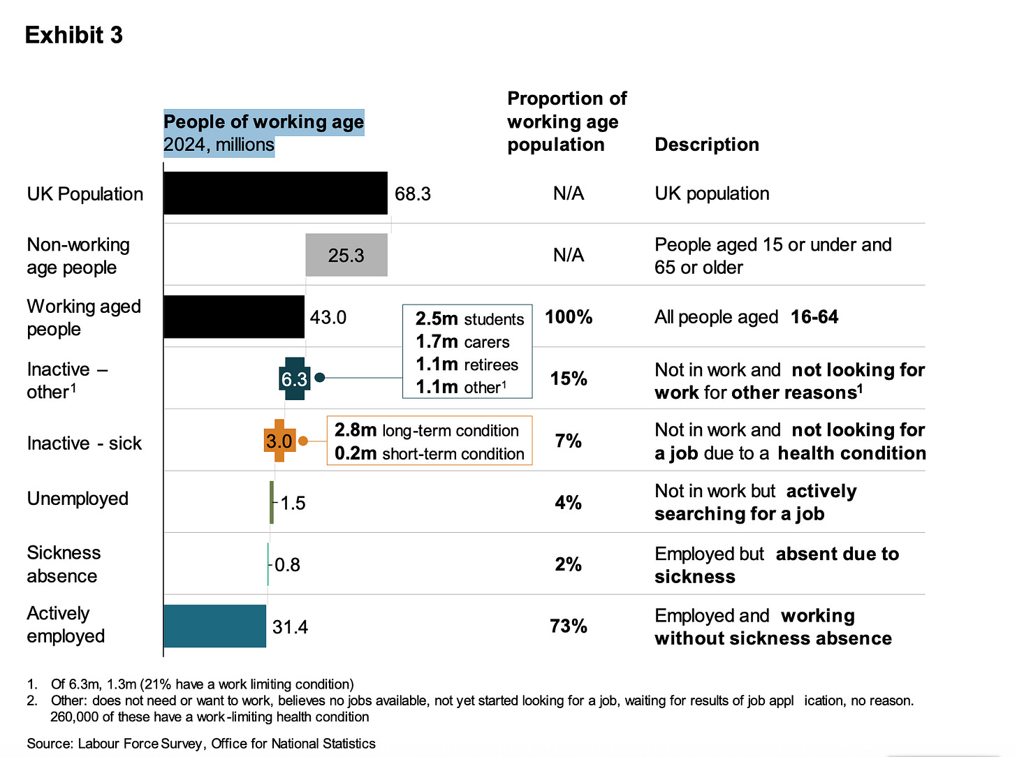 The report uses ONS data from 2024, but it focuses on 3 million people who are ‘Not in work, and not looking for a job due to a health condition’. Carers (1.7m) are highlighted here but seem to be disregarded as ‘Inactive-other’ because they are ‘Not in work and not looking for work for other reasons’