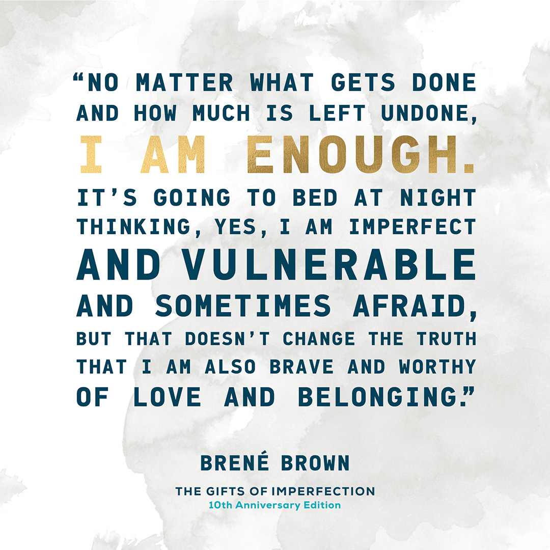 Remember this from Brené Brown. The Gifts of Imperfection | No matter what gets done and how much is left undone, I am enough.