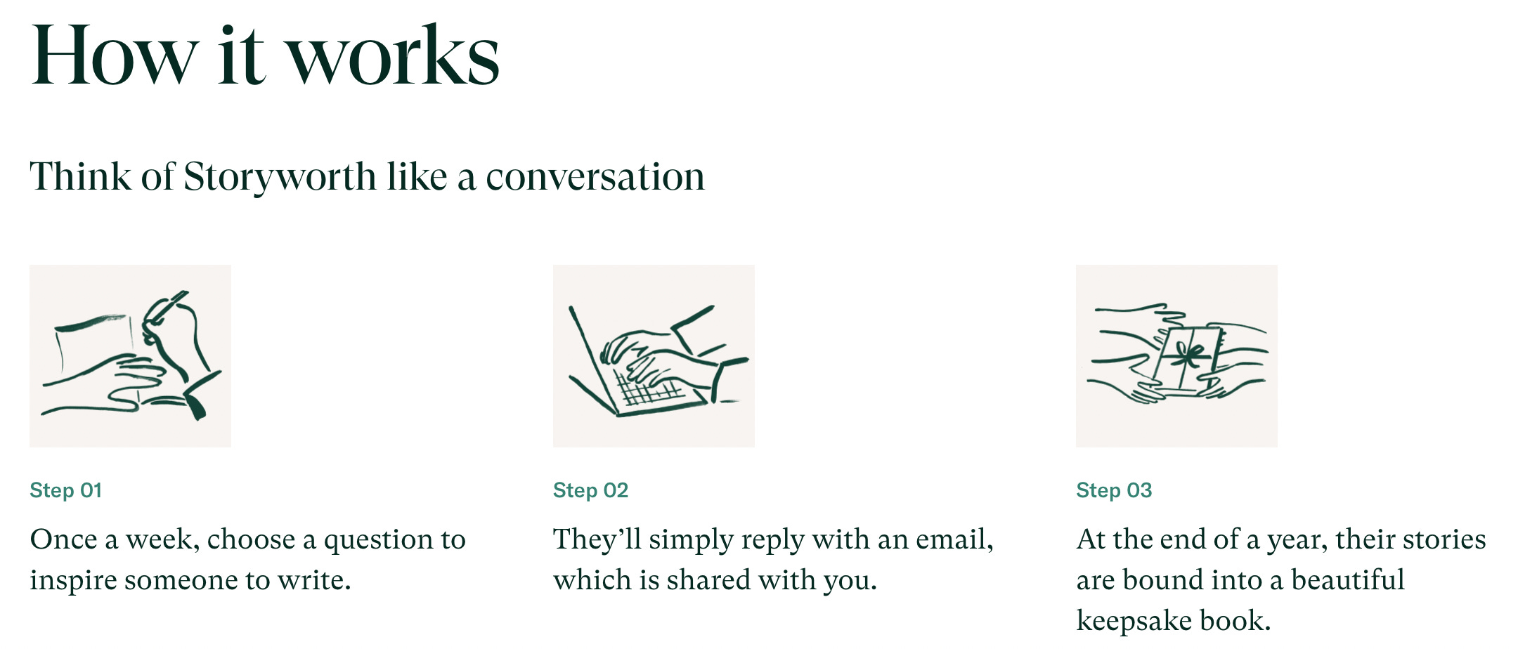 Storyworth and The Life Story Project. Preserve meaningful moments and memories in a beautiful keepsake book. Then, share the experience with loved ones and discover stories you never knew.