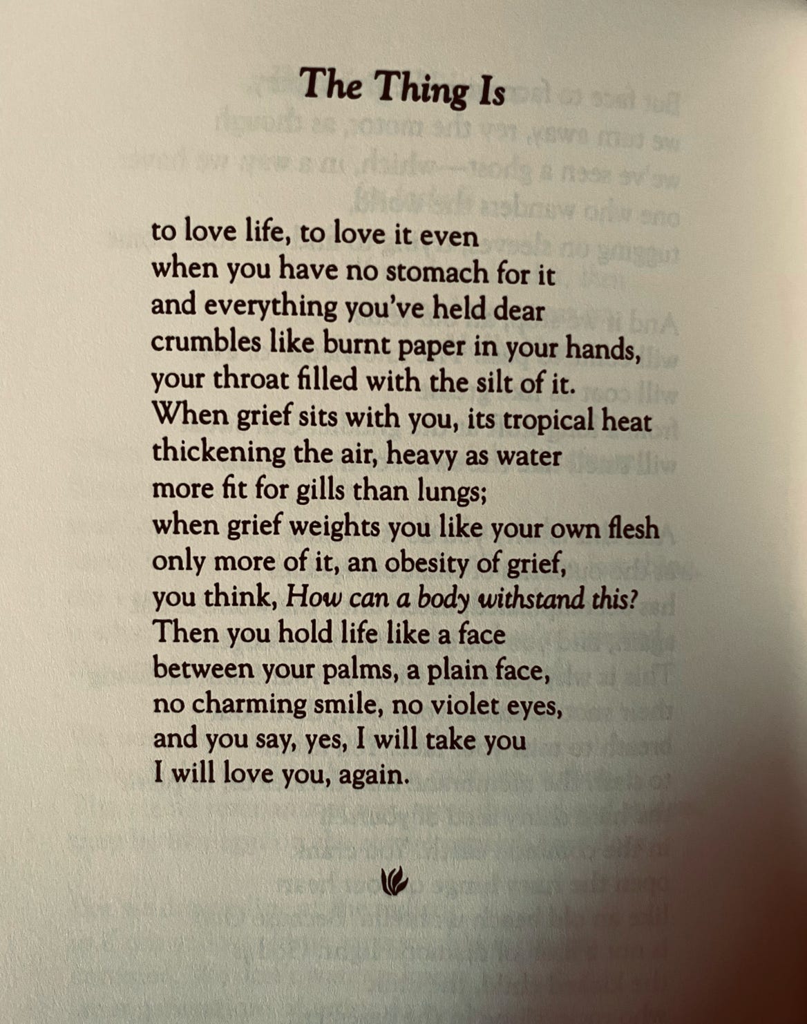 That opening, painful as it is, will also bring new things into your life. Slowly, you’ll find ways to accept what is happening. You’ll begin to touch more aliveness; what once felt dulled will become more vibrant. You’ll develop a love for what is. As Ellen Bass writes, to love life, even when you have no stomach for it, becomes your daily practice. You’ll take life in both hands and say, I will take you. This is intimacy with life.